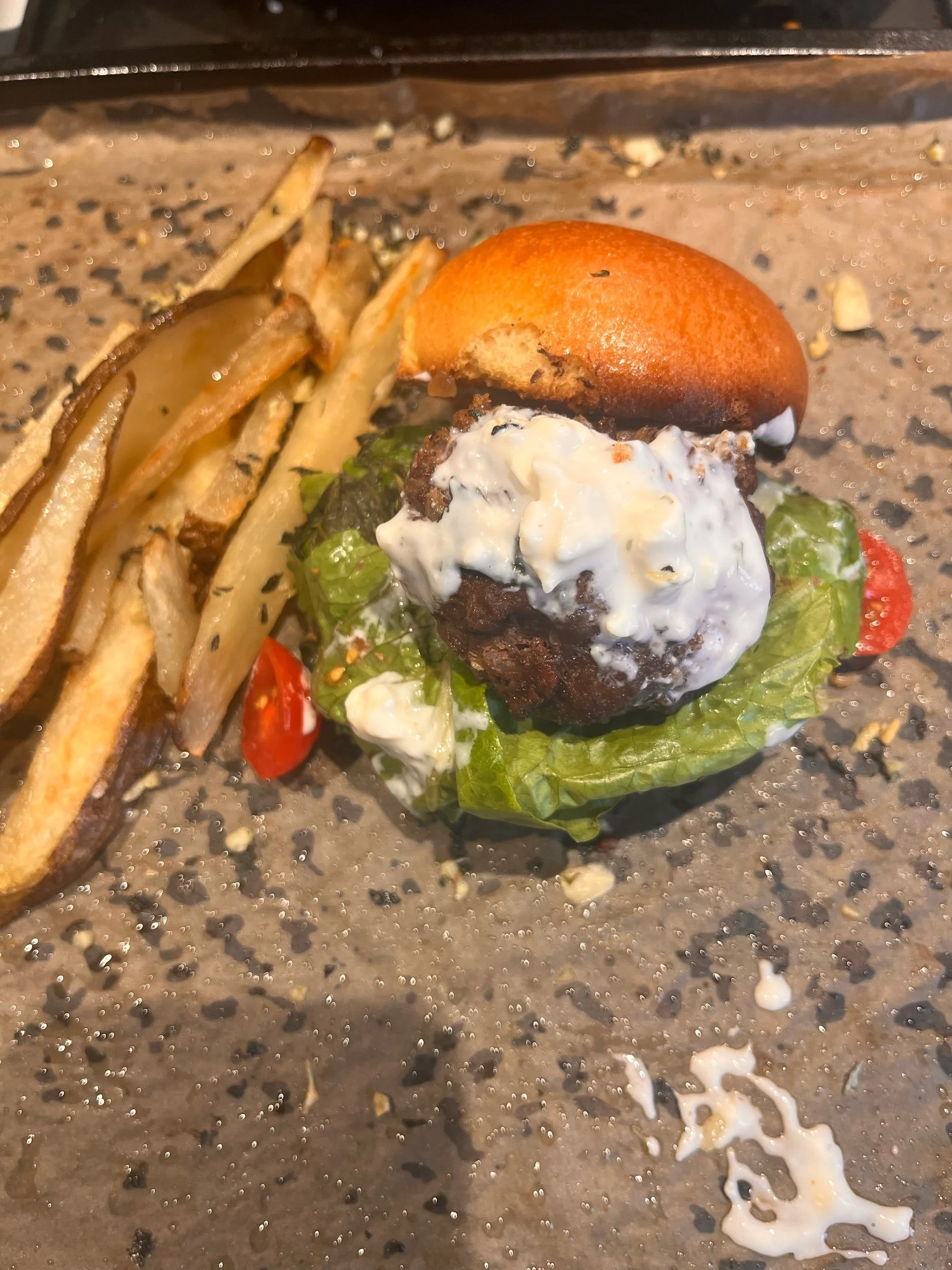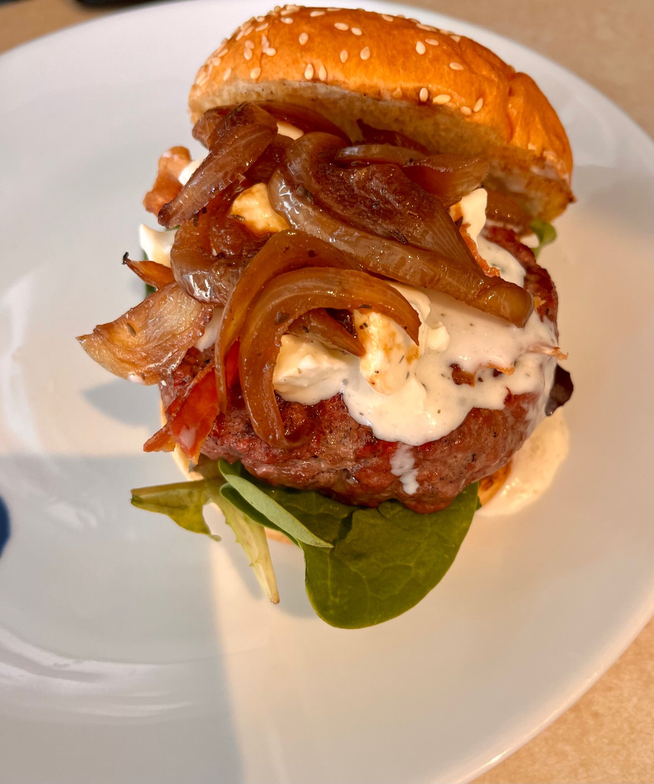 Burgers: 90/10 ground beef, eggs, panko bread crumbs, caramelized onions, pork bacon, Worcestershire, onion powder, garlic powder, salt, pepper