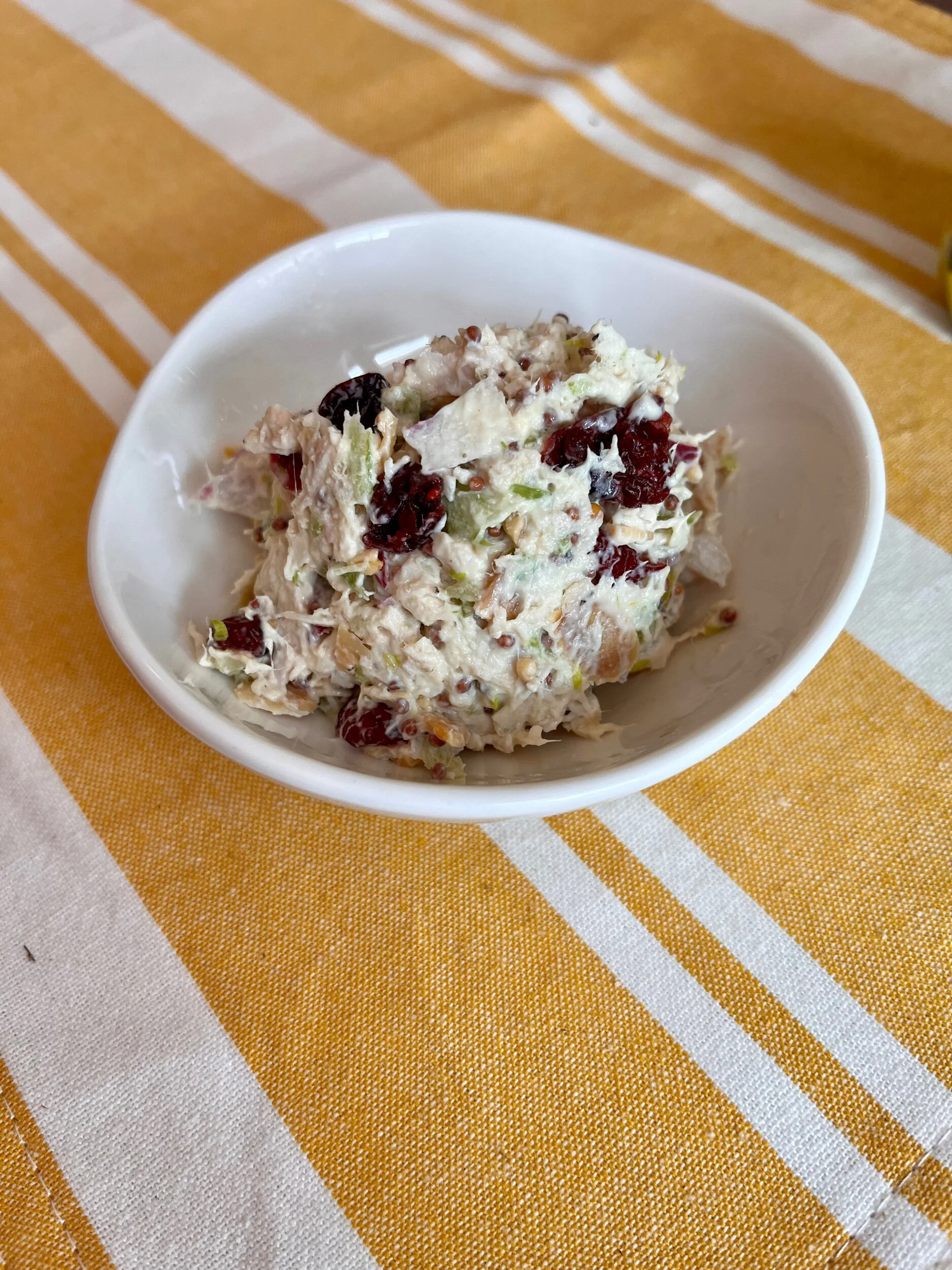 Boneless skinless chicken breast roasted with salt and pepper, celery, red onion, toasted almonds, dried cranberries, 0% fat plain greek yogurt, grainy dijon mustard