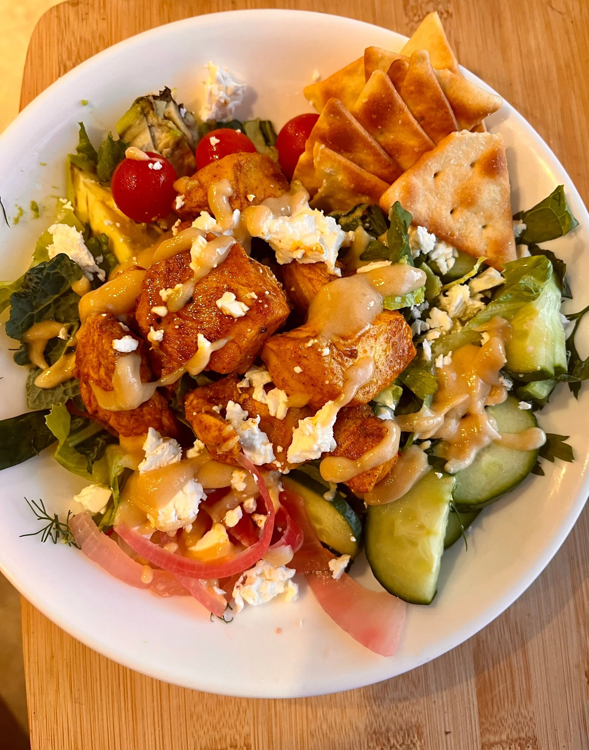 3 oz cooked chicken, 1 cup of lettuce, kale, herb, cucumber, tomato and feta salad, 2 Tbsp of tahini sauce and 1 oz of pita chips