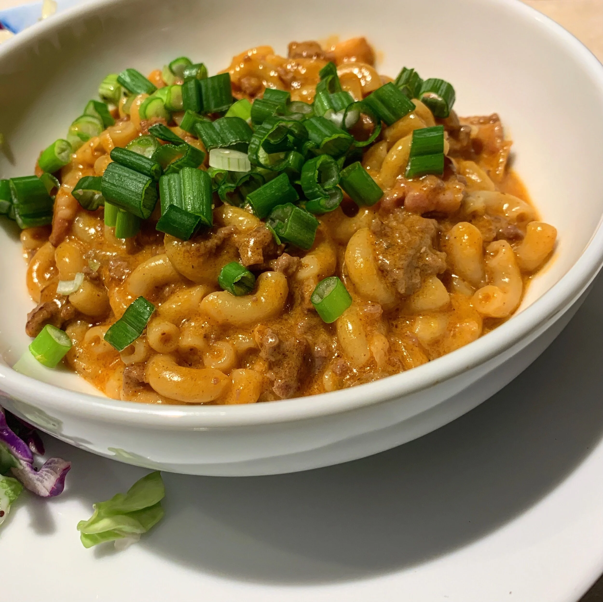 Olive oil, onion, garlic, turkey bacon, ground beef, white wine, house made chicken stock, half and half, hot sauce, smoked paprika, elbow pasta, American cheese, cheddar cheese, scallions