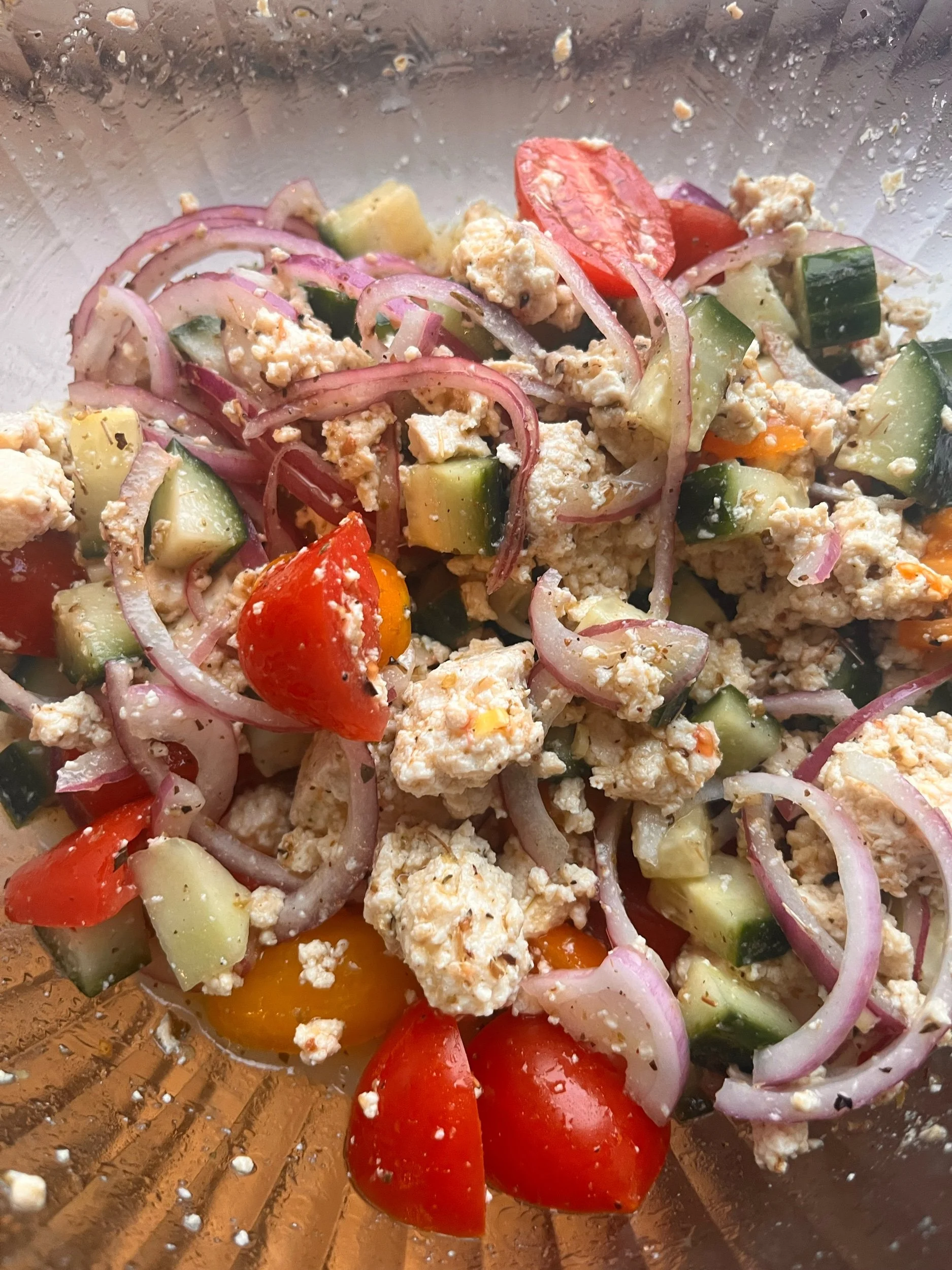 Tomatoes, red onions, cucumber, tofu feta (Feta cheese, lemon juice, olive oil, nutritional yeast, oregano), red wine vinegar, salt, pepper