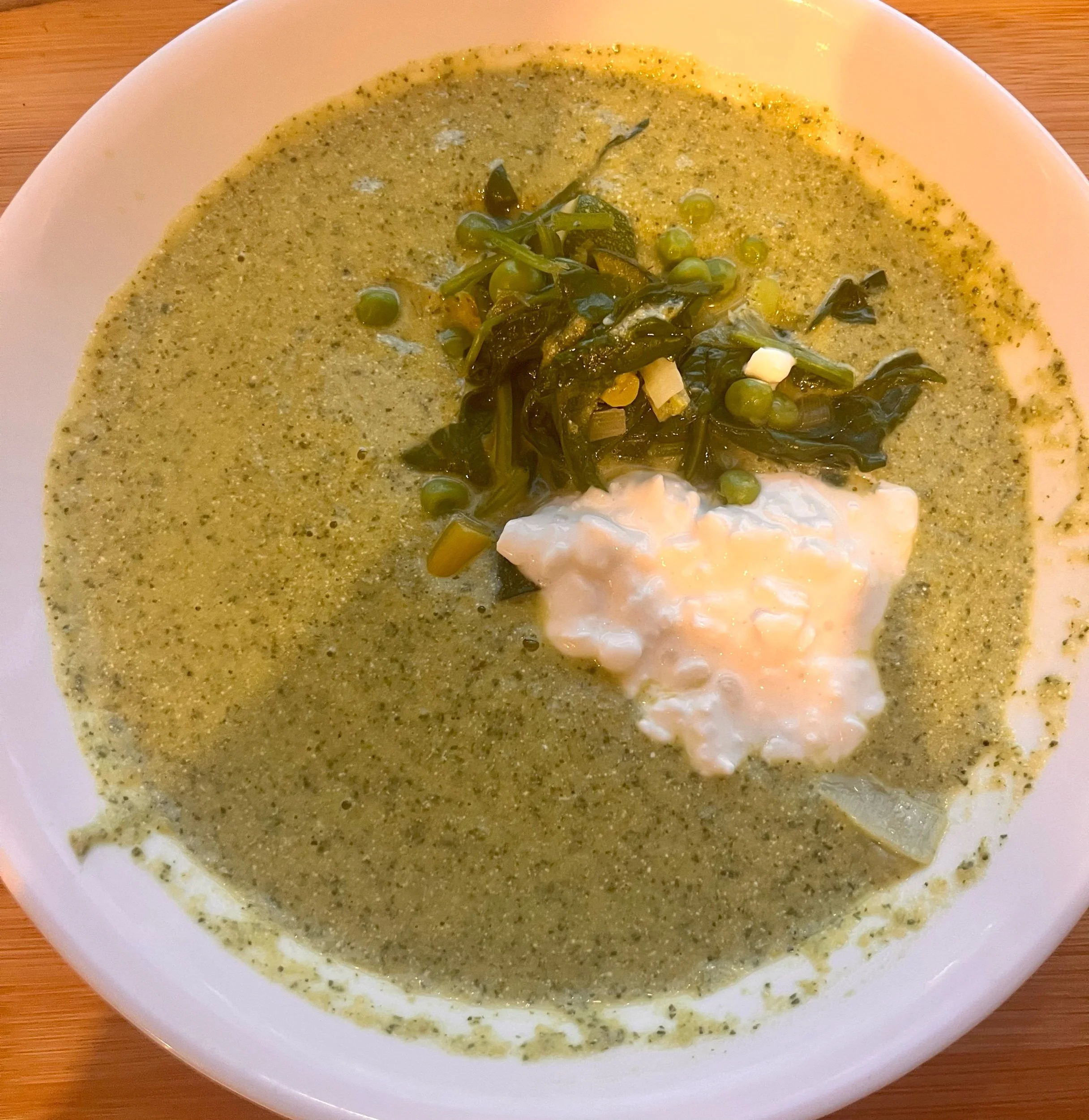 When I tell you I could not stop eating this soup! A blended soup of zucchini, leeks, green peas, spinach, cannelloni beans, and cottage cheese plus basil pesto and lemon. It is bright, it is filling, and goes amazingly well with sour dough toast.