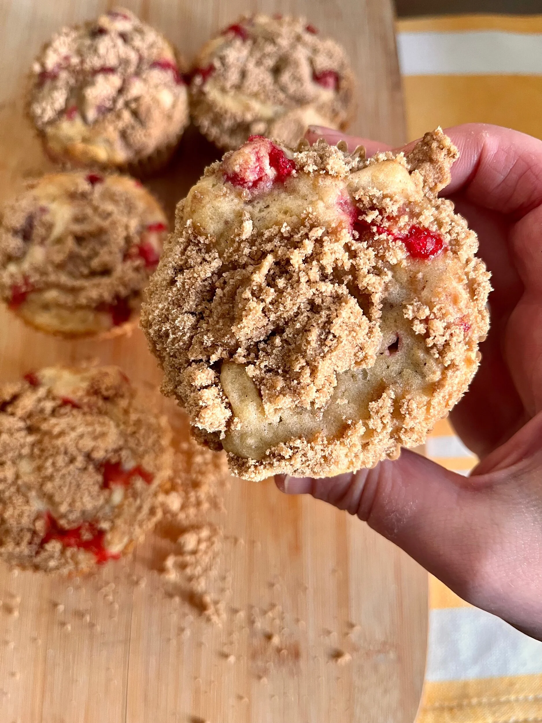 Brown butter, vanilla, walnut, and orange muffin with tons of fresh cranberries, topped with a crunchy brown sugar strudel
