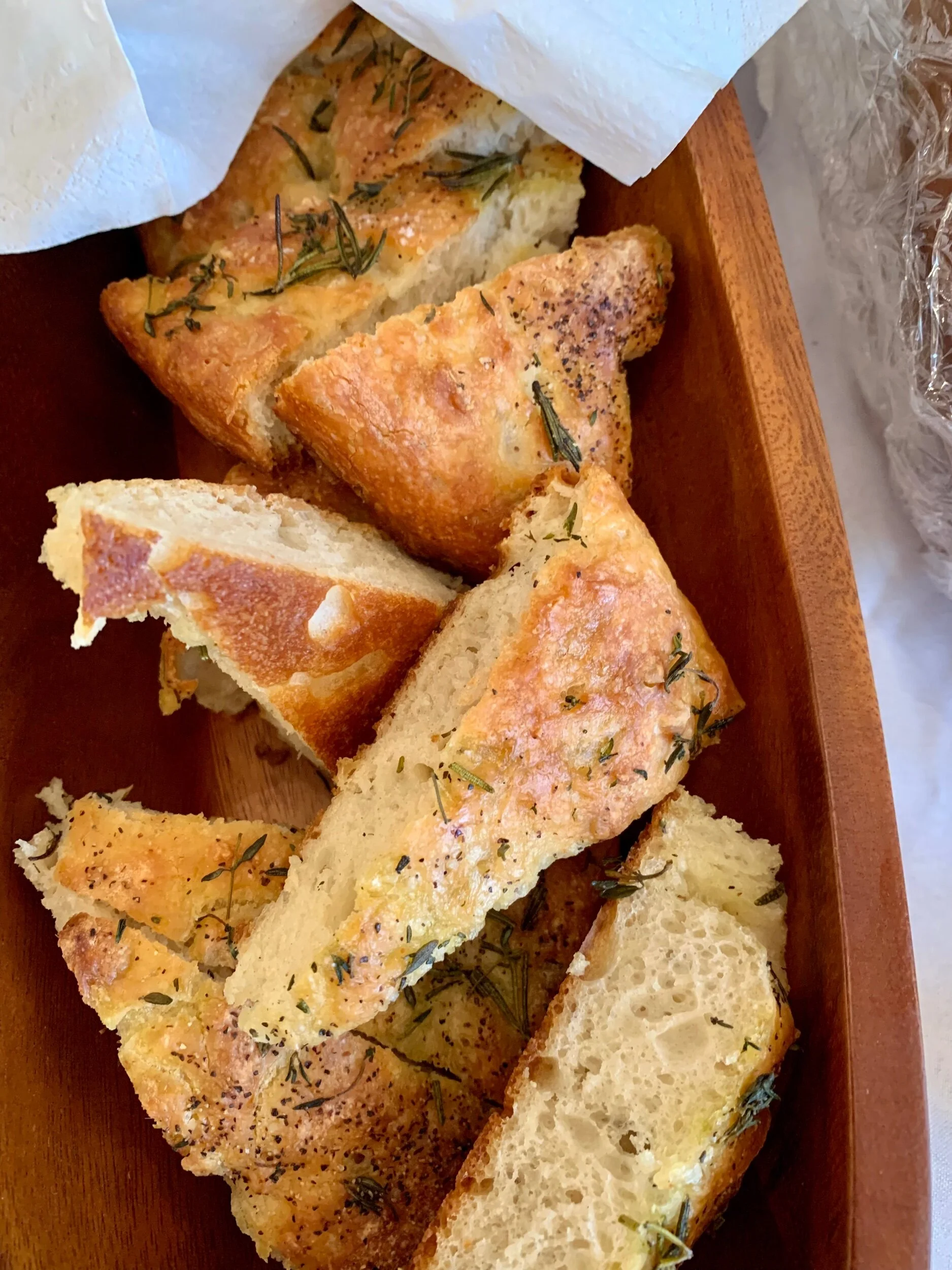 Flour, salt, yeast, water, fresh rosemary, fresh thyme, flakey sea salt, cracked black pepper, extra virgin olive oil