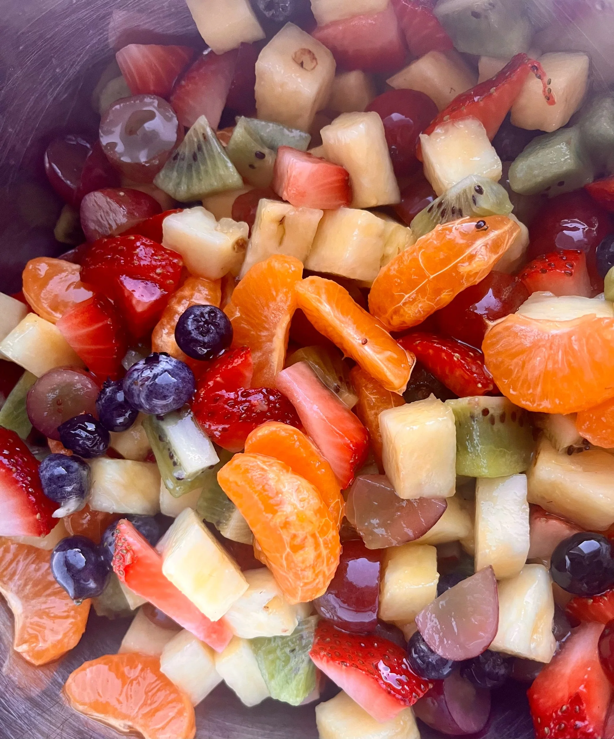 Red: Strawberries | Orange: Clementines | Yellow: Pineapple | Green: Kiwi | Blue: Blueberries | Purple: Grape. All tossed in a honey lime vinaigrette.