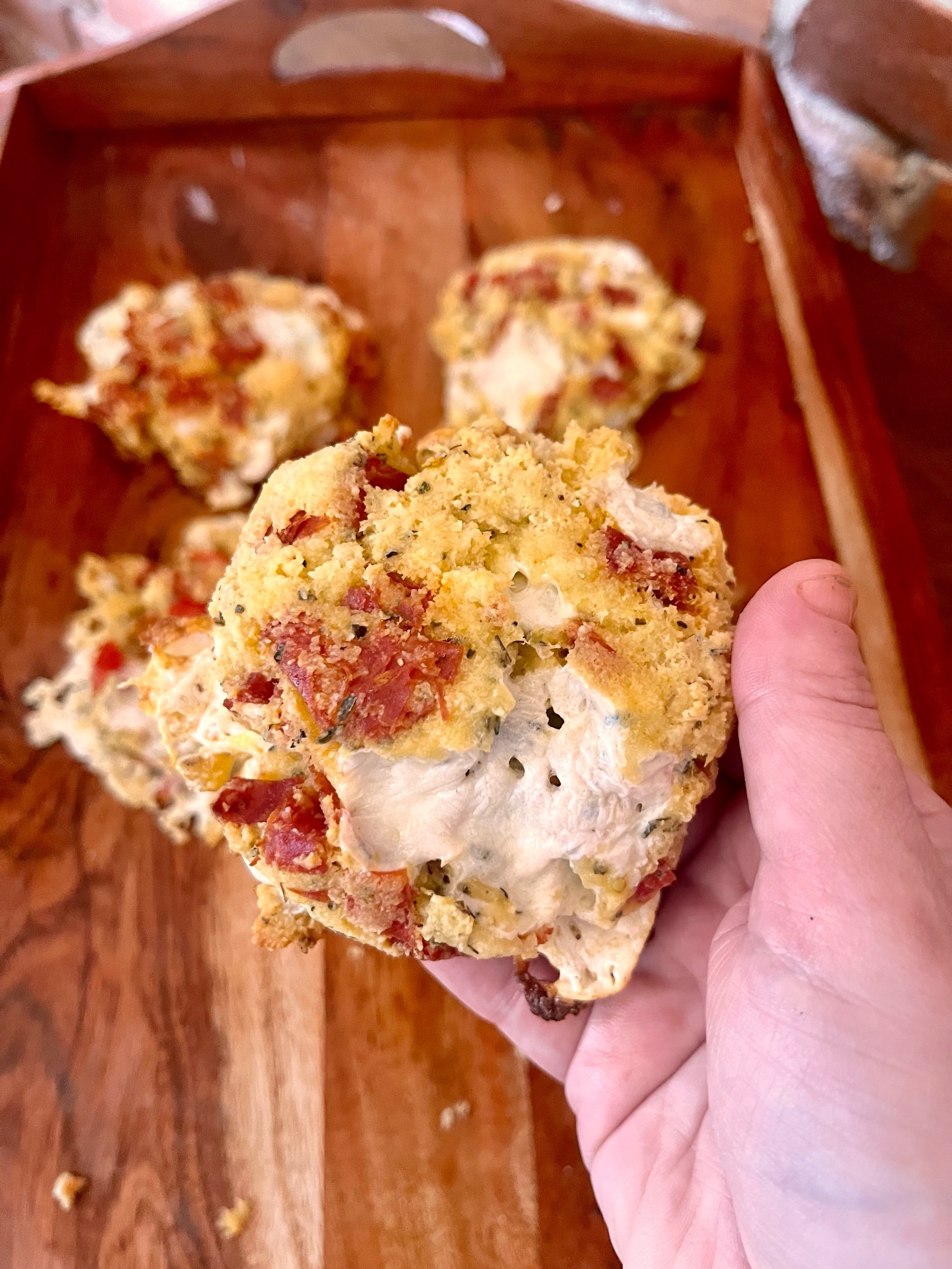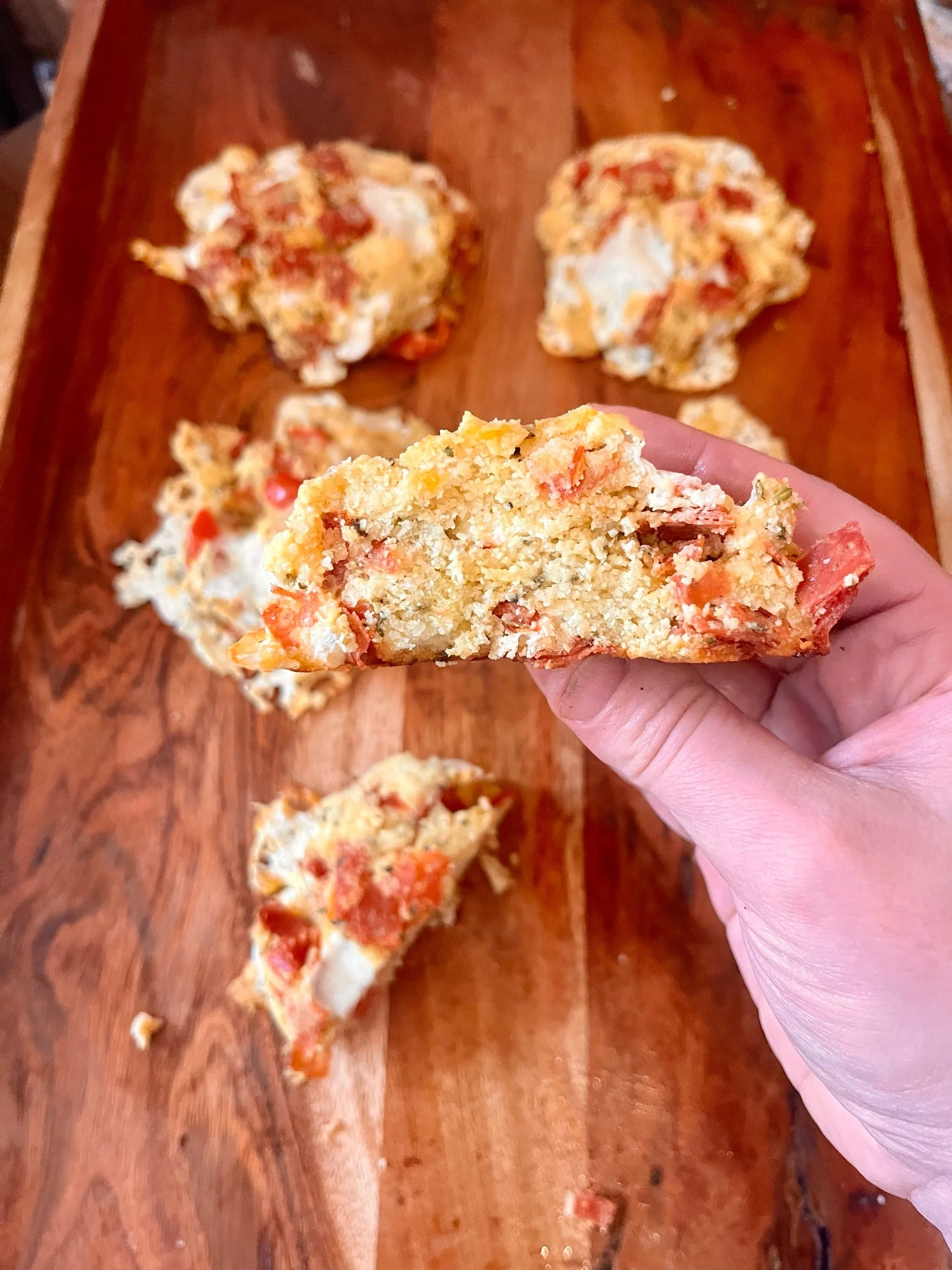If you like the breakfast biscuits, these babies would be great for breakfast, lunch, brunch or even a pre-workout afternoon snack! Almond flour based, eggs, pepperoni, peppers, onions and mozzarella cheese and some Dash Pizza Sauce mixed right in.