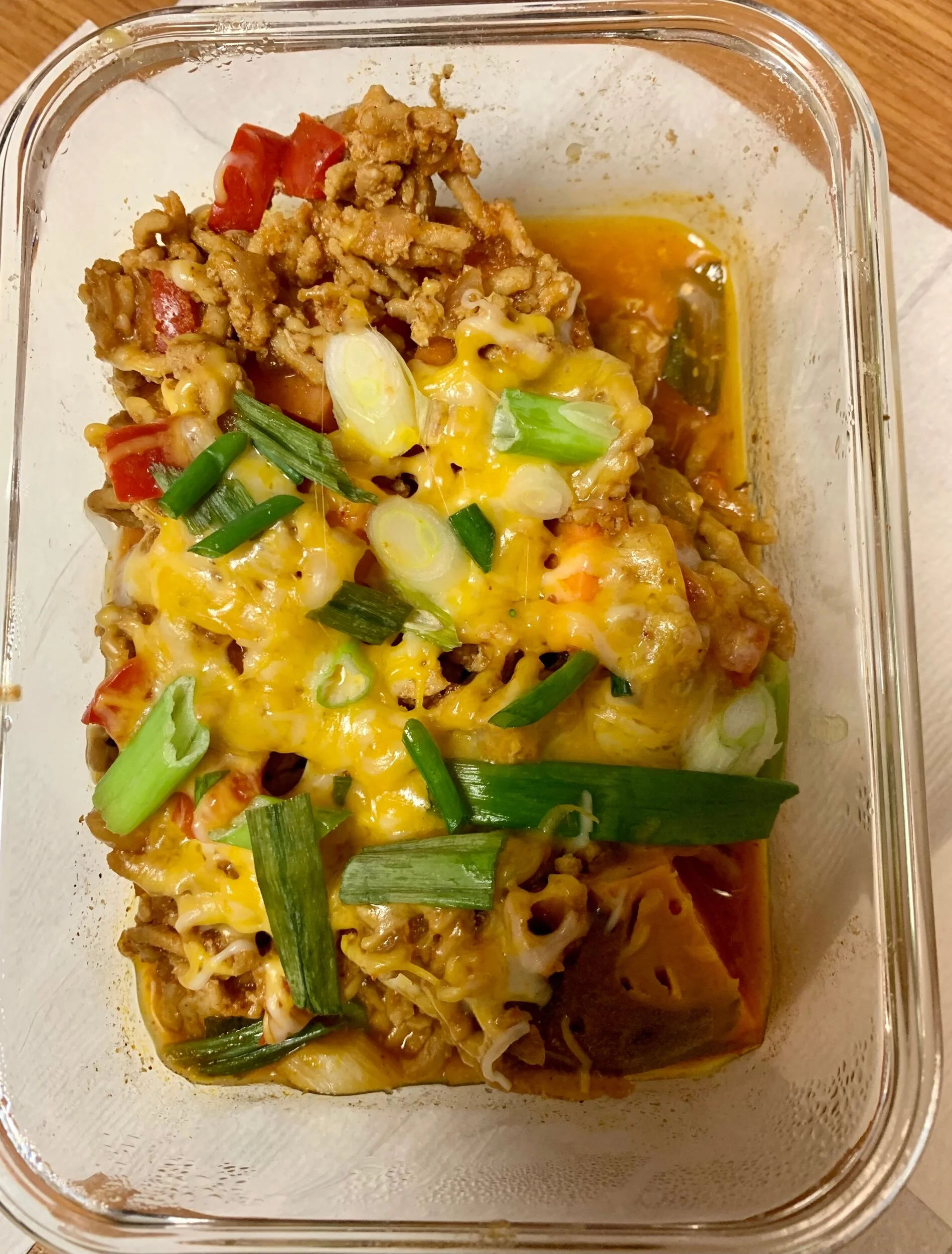 Topping: cheddar/jack cheese blend, scallions