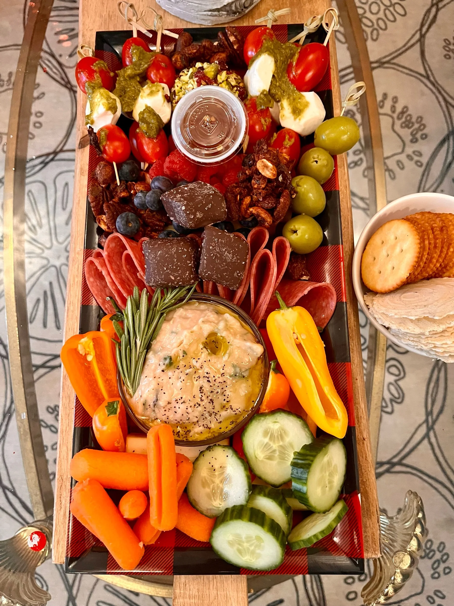 All board include: Dash spiced nuts, Dash made cheese ball, caprese skewers, Dash’s French onion dip, charcuterie meats, veggies, fruits, chocolates, olives and crackers on the side so they don’t get soggy