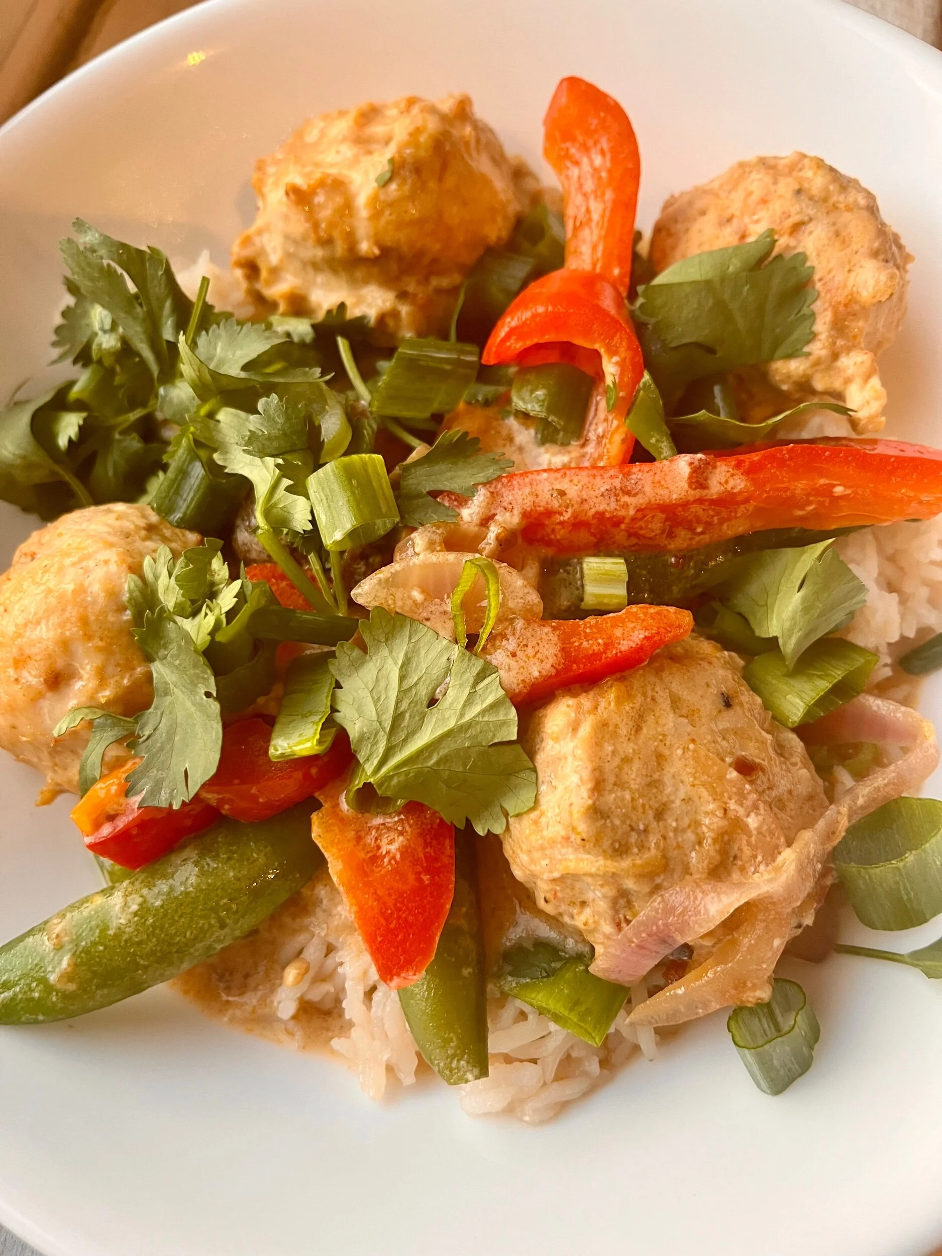 Serving of 3 meatballs, 2/3 a cup of rice, 1/2 cup of veggies and herbs and 1/2 cup coconut curry broth