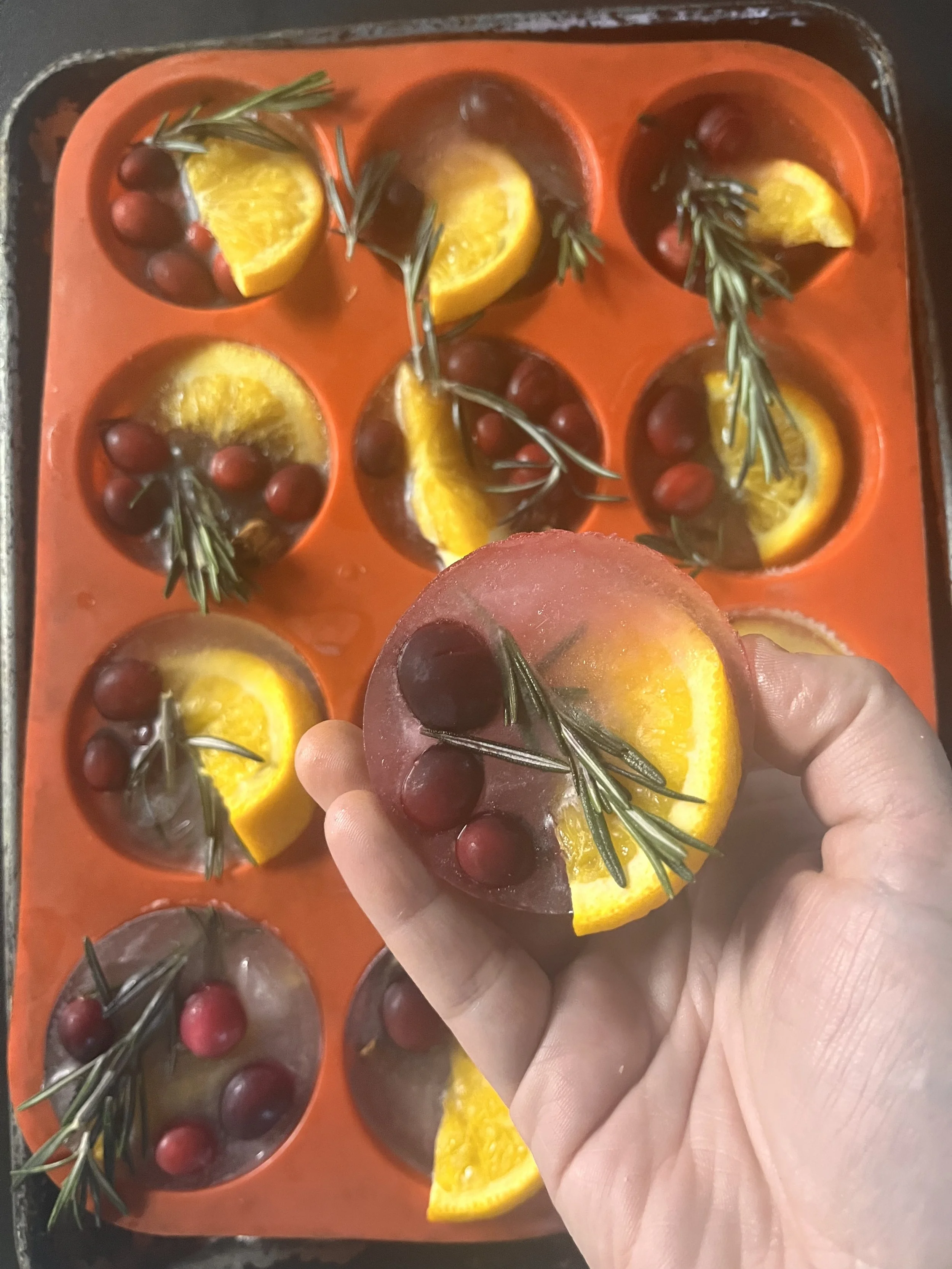 Using a silicone ice cube tray or cup cake mold, add in all the fruit, herbs and spices